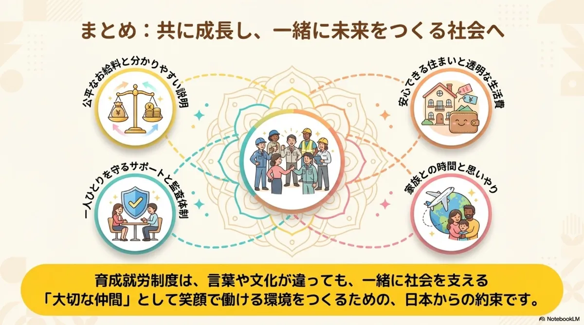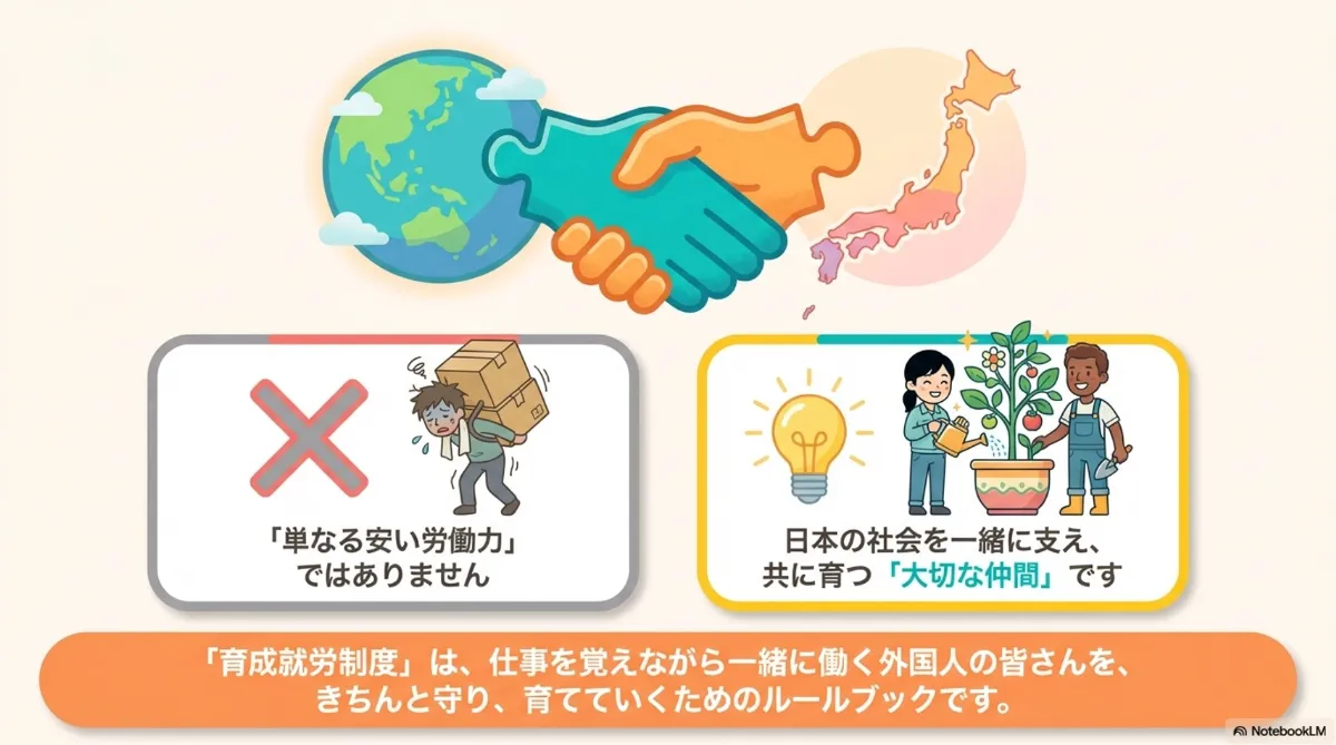 重要なポイントは、育成就労制度が、外国から来た人をただ働いてもらう存在ではなく、安心して一緒に未来をつくる仲間として迎えるための仕組みだということです。