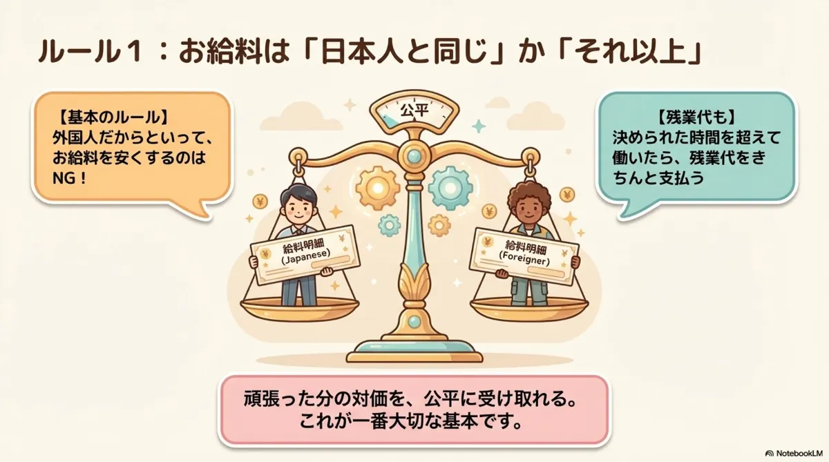 お給料の公平さ、分かりやすい説明、安全で清潔な住まい、費用の透明さ、家族への配慮、受け入れ人数の上限、そして支援と監査の仕組みまで、外国人の方を守るための決まりがしっかり整えられています。