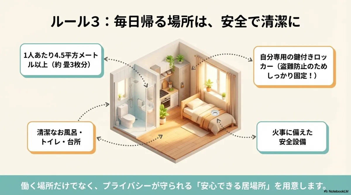 火事に備えた設備、お風呂やトイレ、台所の清潔さ、プライバシーへの配慮なども大切です。働く場所だけでなく、毎日帰る住まいも安心できる場所でなければなりません。