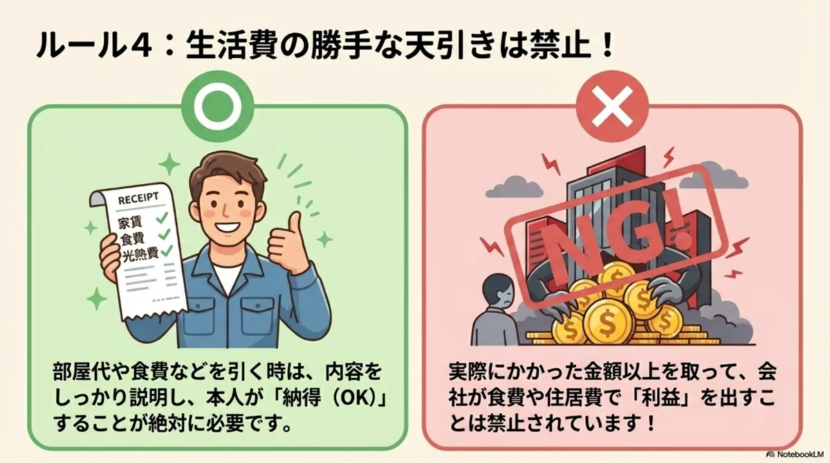 食費や部屋代、水道光熱費などを差し引く場合には、本人に内容をきちんと説明し、納得してもらう必要があります。会社が一方的に決めることはできません。