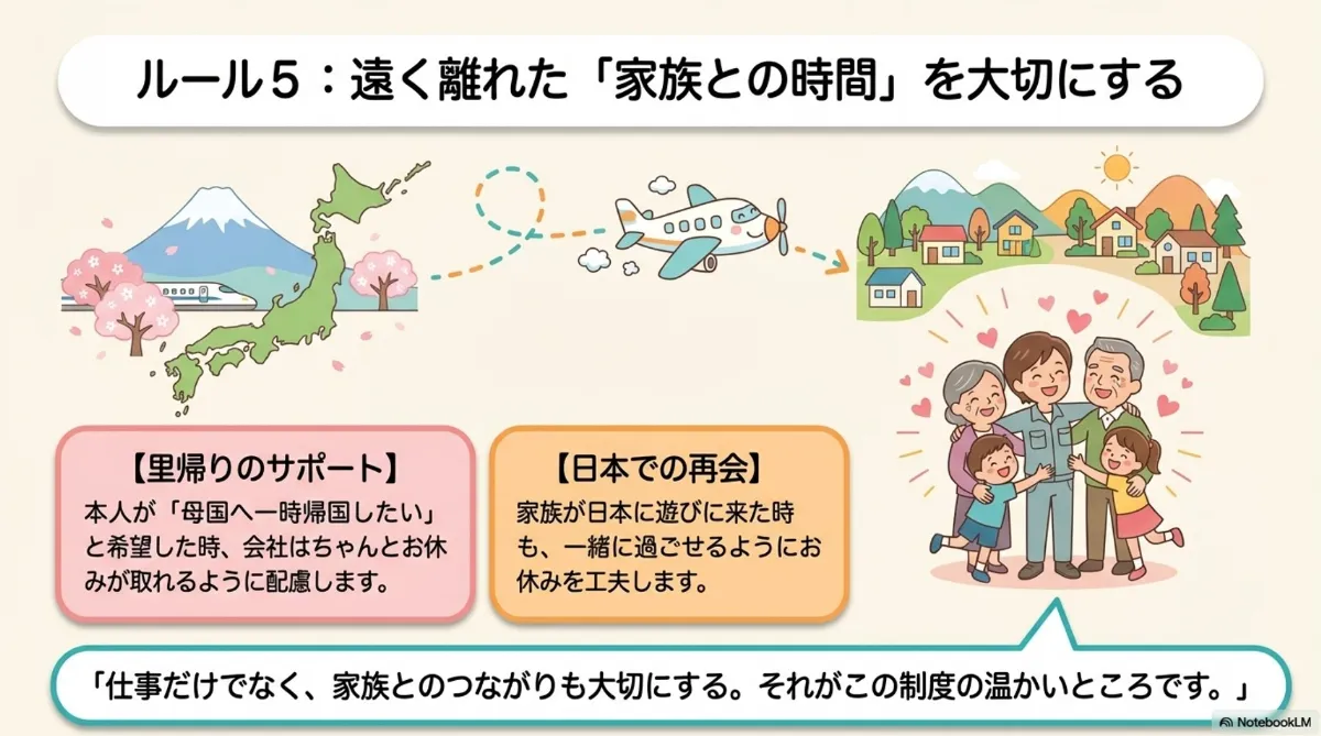 また、家族が日本に来た場合に、一緒に過ごせるように休みを工夫することも望ましいとされています。