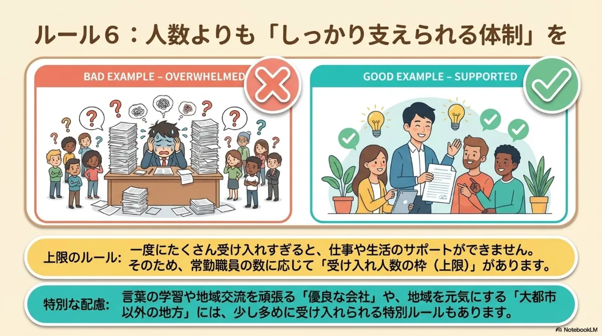 言葉の学習を助けたり、地域交流に力を入れたりしている優良な会社には、少し多めに受け入れられる仕組みもあります。さらに、大都市以外の地域では、地方を元気にするために特別なルールが設けられている場合もあります。